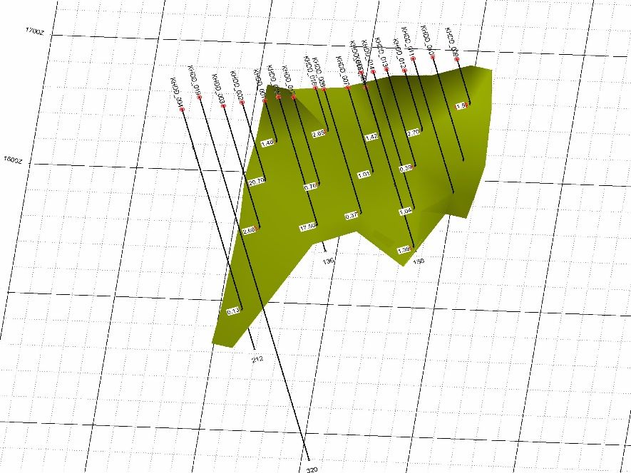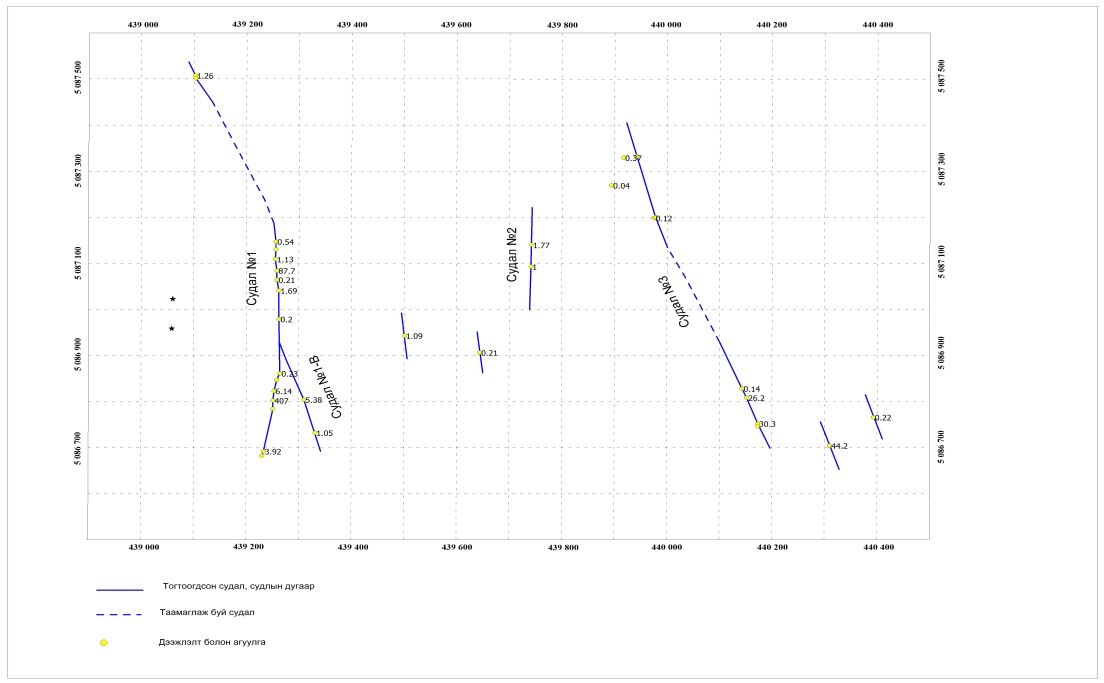 The quartz vein in the West of the area is 600m long and 0.2-0.8m width with limonite, pyrite, malachite and gold fracture infilled. It strikes 360degree. Based on the assay result, Au is 1.1-149g/t. Due to the technical conditions of the mountain, detailed exploration research and field work was carried out at 200m.